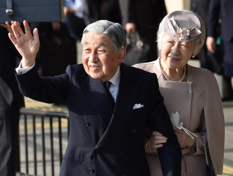 Japan's Emperor Akihito, accompanied by Empress Michiko, waves to well-wishers before leaving Ujiyamada Station in the central Japanese prefecture of Mie, on April 18, 2019.