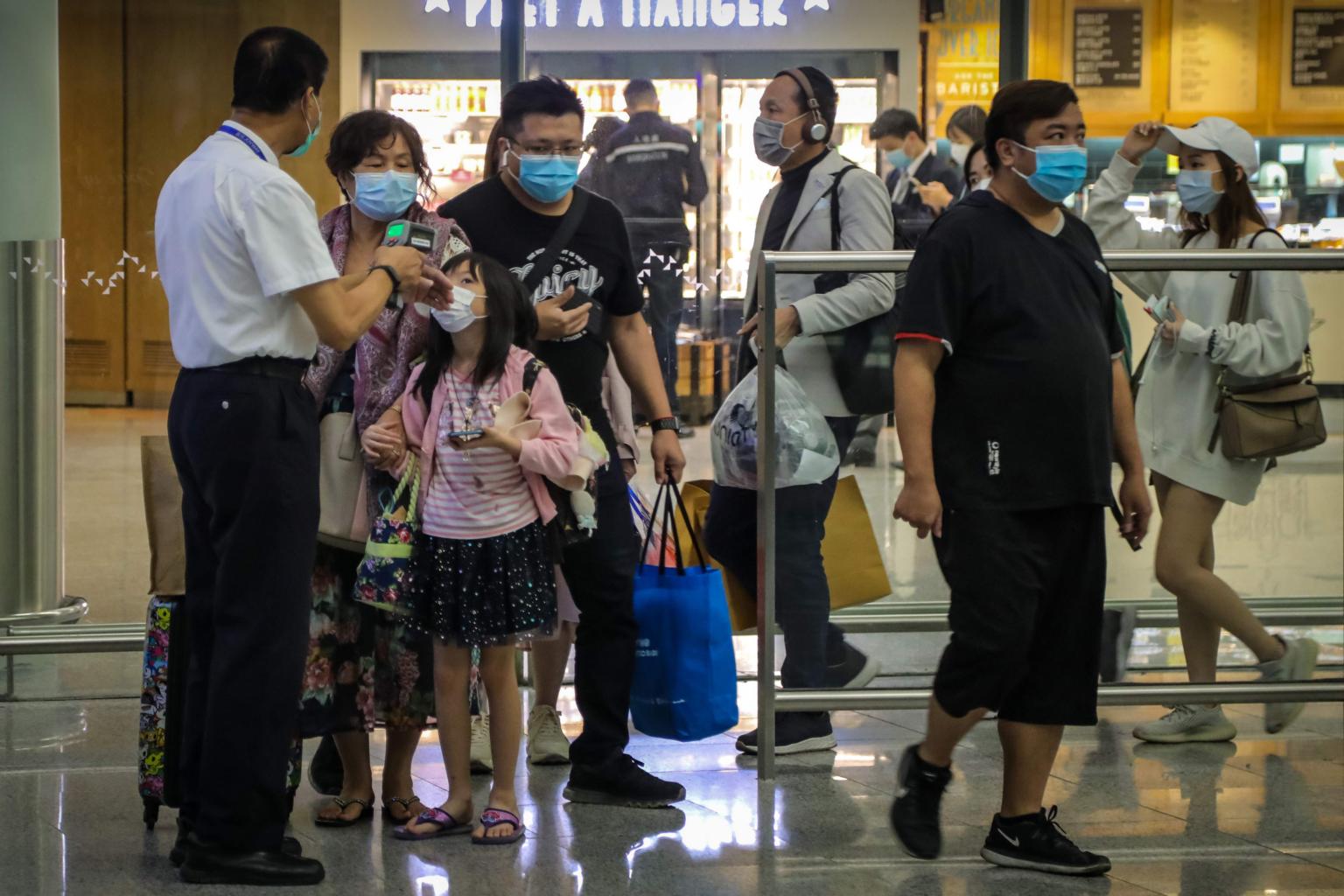 In a photo taken on Feb 21, 2020, a passenger has her temperature measured by airport health staff with an infrared thermometer after she arrives inside Hong Kong International Airport.