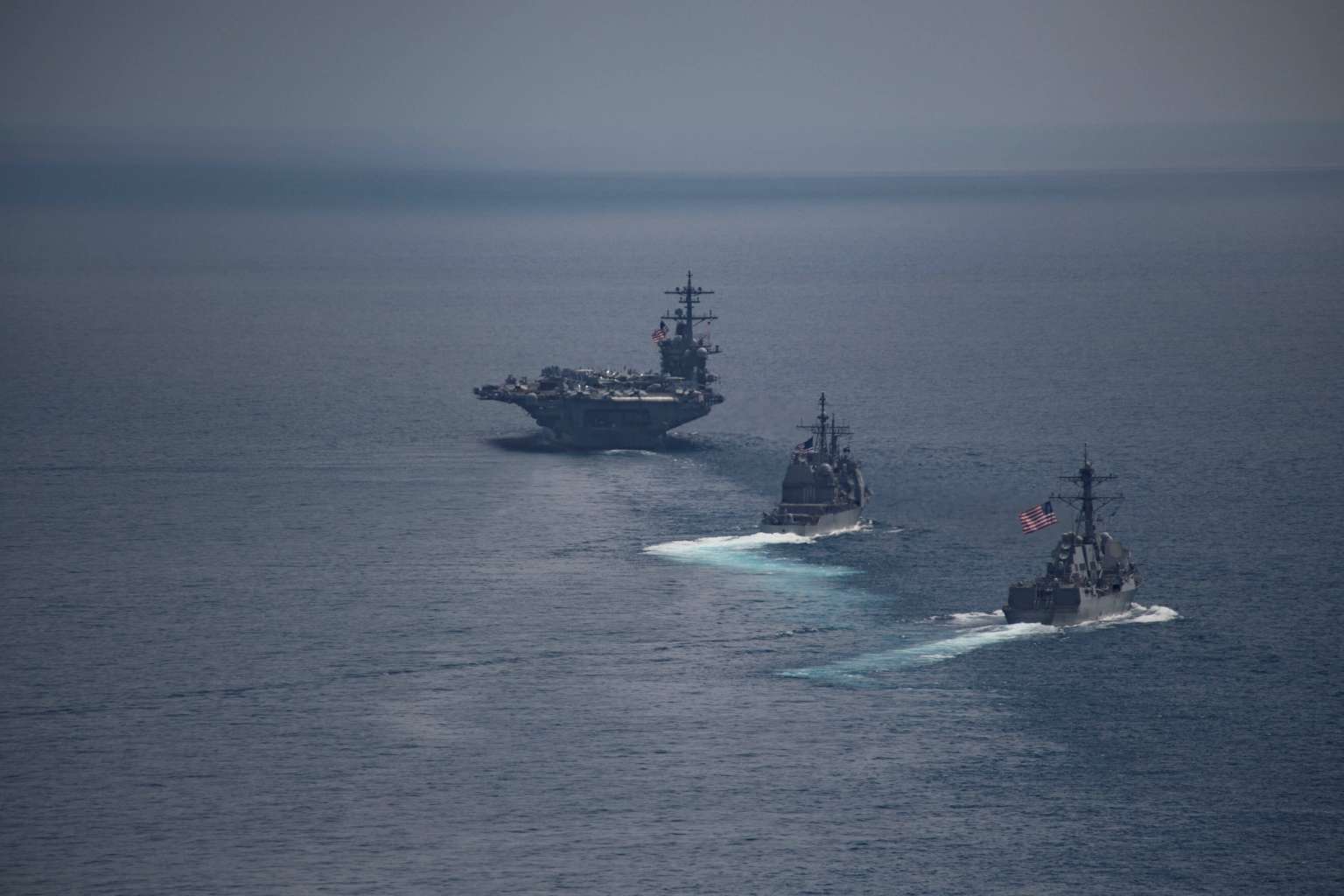 The aircraft carrier USS Carl Vinson leads the USS Michael Murphy and the USS Lake Champlain, in the Indian ocean on April 14, 2017.