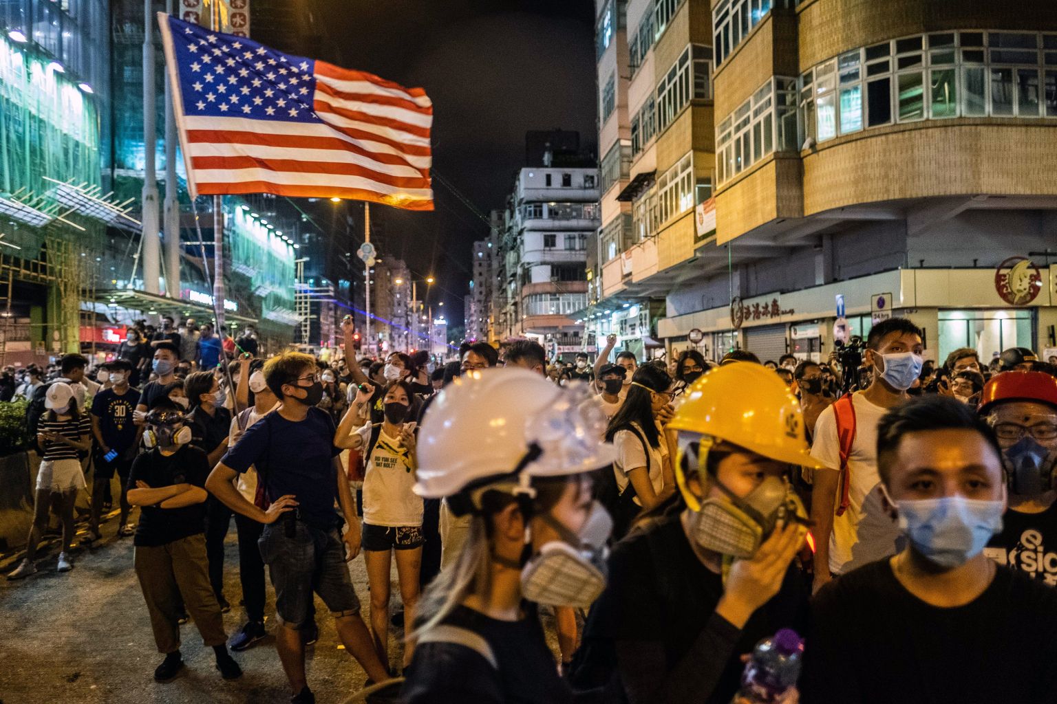 A protester flies the flag of the US as others train laser pointers on the police station in the Sham Shui Po neighborhood of Hong Kong.