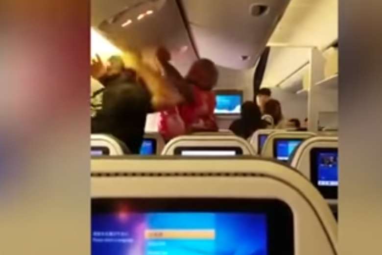 Video of the fight, taken by a passenger, has been widely circulated online. In it, a man wearing a red Hawaiian-style shirt punches a man in a black T-shirt, who fights back and then shouts: "Go to hell. This guy is crazy!"