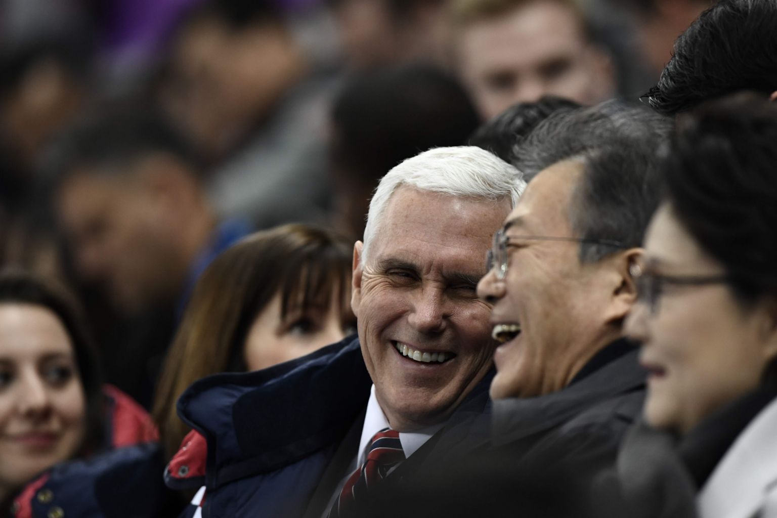 US Vice-President Mike Pence (centre) talks to South Korea's President Moon Jae-in during the short track speed-skating event.