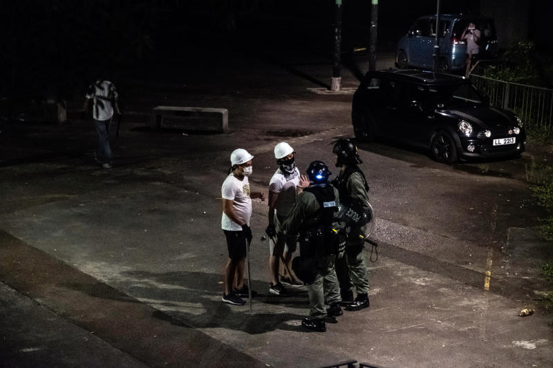 Riot police officers talk to men armed with sticks outside a train station in Yuen Long, a Hong Kong border town near mainland China, on June 21, 2019.
