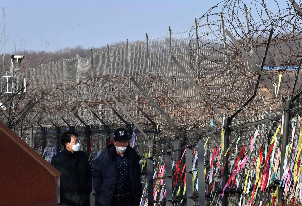 Visitors walk past a military fence decorated with ribbons at the Imjingak peace park near the demilitarized zone in Paju on Jan 1, 2022.