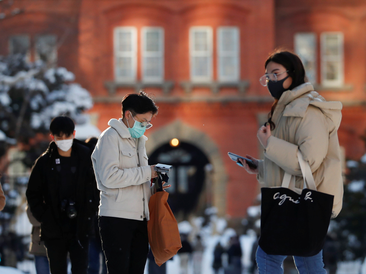 People wearing masks are seen in front of the former Hokkaido Government Office building in Sapporo, Hokkaido, on Feb 26, 2020.