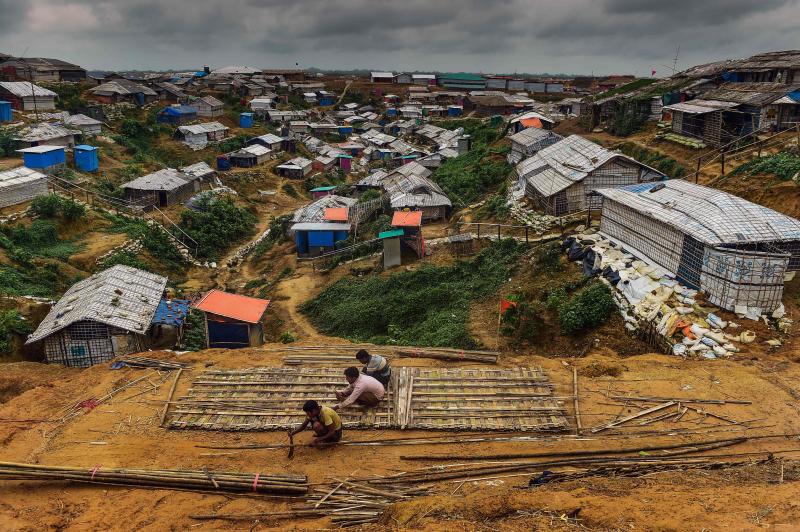 Rohingya refugees use bamboo to build a shelter at Balukhali refugee camp in Ukhia, Bangladesh, on July 21, 2018.