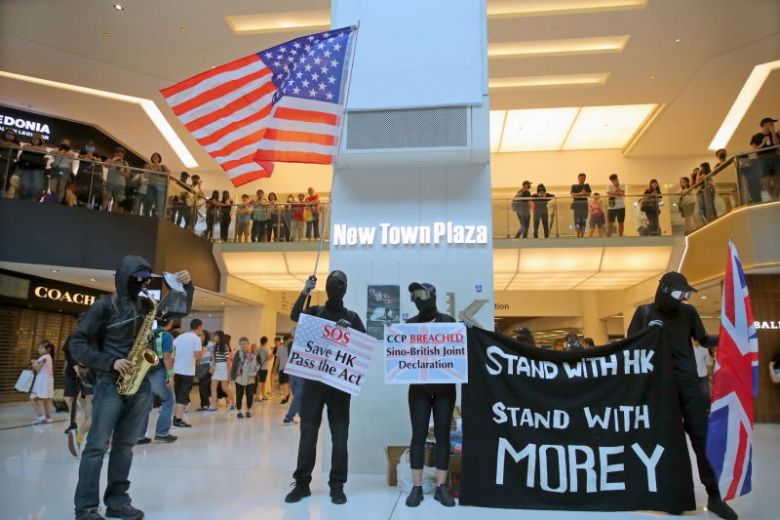 At New Town Plaza in Sha Tin, protesters sang the Cantonese protest anthem, Glory to Hong Kong, to a live saxophone rendition, according to TV footage from Apple Daily.