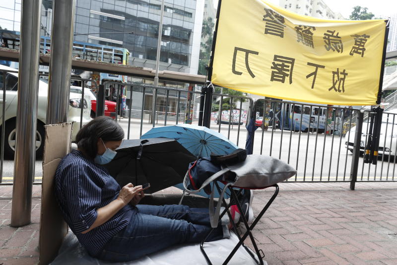 A participant of a 48-hour sit-in, to protest alleged abuse of protesters by Hong Kong police, outside the Wan Chai police station on Oct 13, 2019.