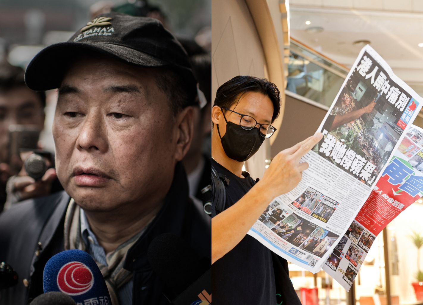 Media tycoon Jimmy Lai Chee-ying (left) founded Hong Kong's now-shuttered Apple Daily (right).