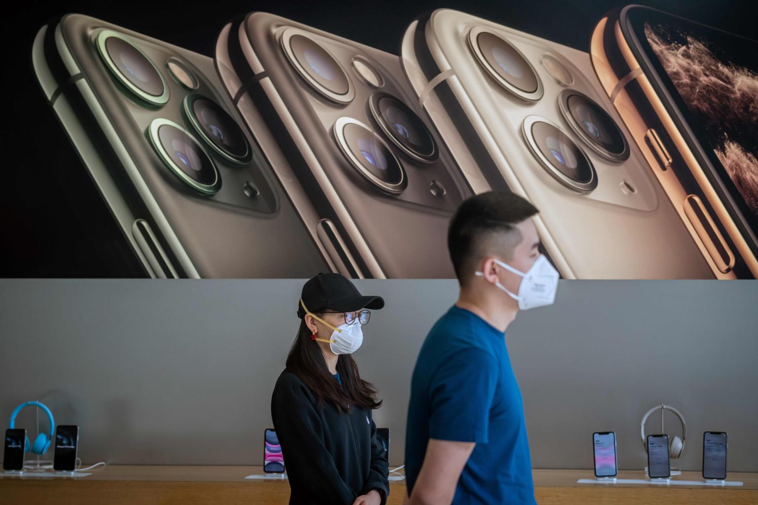 Apple staff wear face masks as a preventive measure at an Apple shop in Beijing on March 11, 2020.