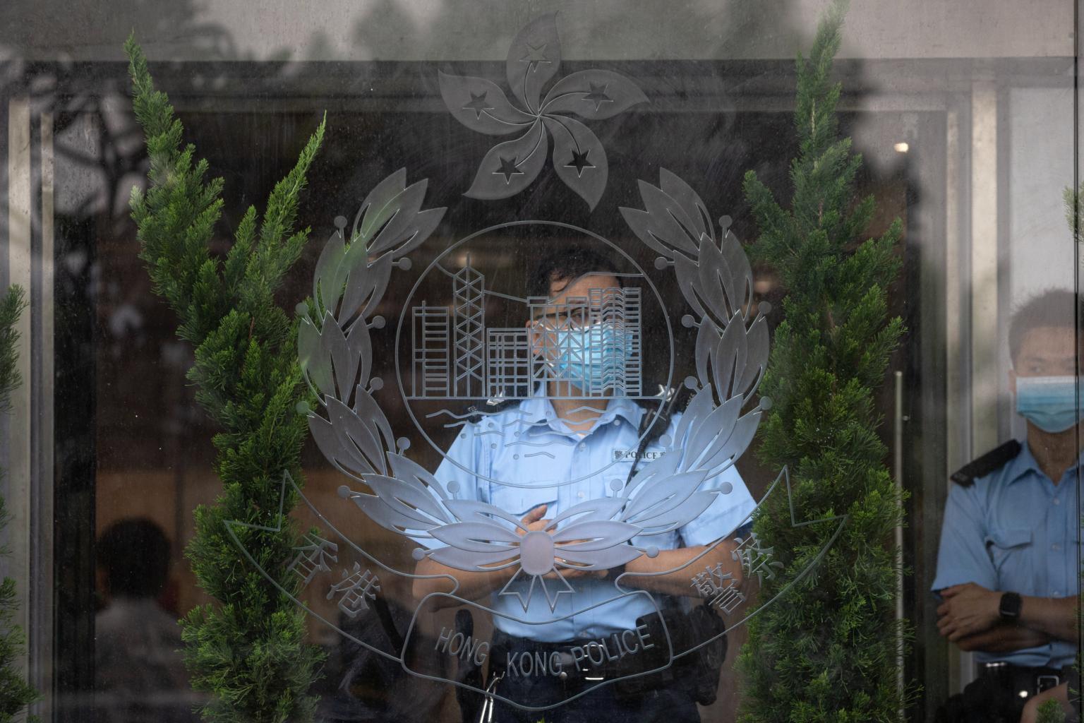 Police officers stand in the lobby of the Central Police Station in Hong Kong, on April 18, 2020.