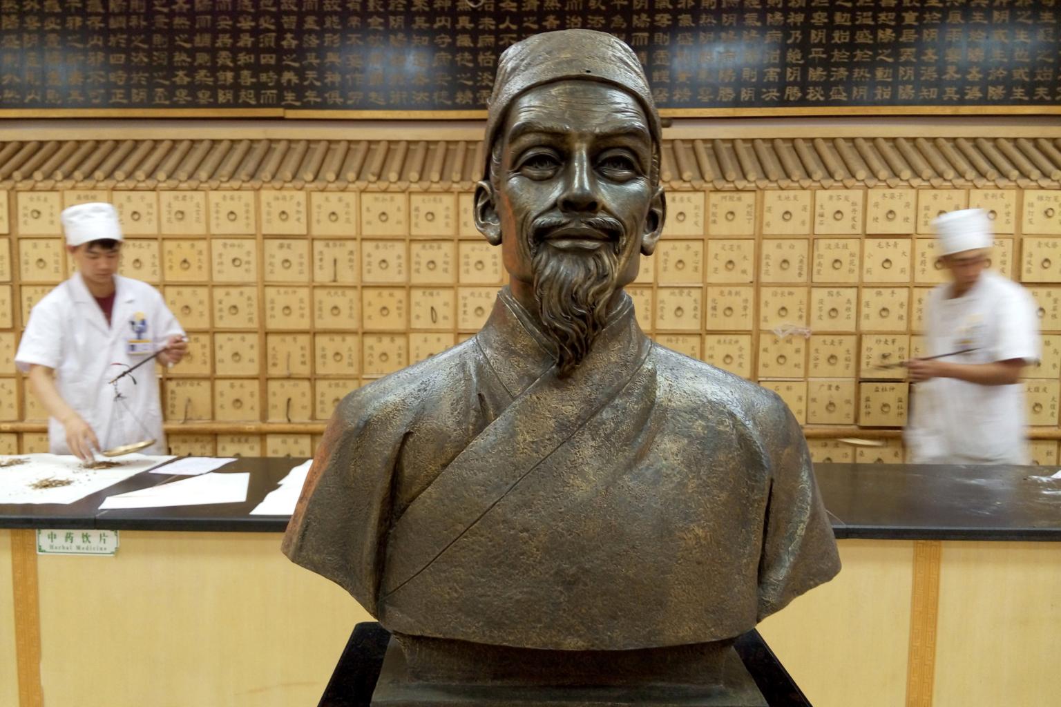 Workers weigh herbs behind a bust portraying Chinese herbalist Li Shizhen of the Ming dynasty, at a traditional Chinese medicine store in Beijing.