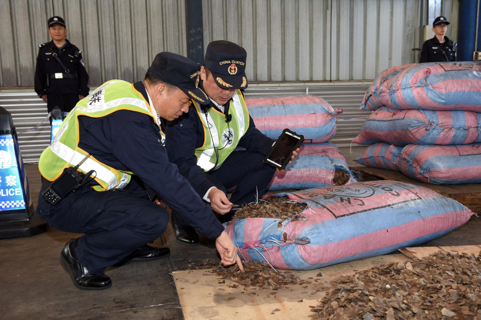 Chinese customs officials inspect scales of pangolins that were seized on a ship in Shenzhen, Guangdong province, China, on Nov 29, 2017.