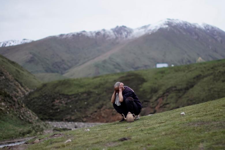 A cordyceps picker cleans himself at a base camp on a mountain in the Amne Machin range in China's western Qinghai province, on June 8, 2019.