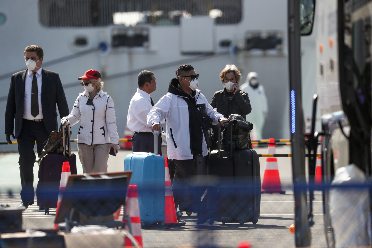 Passengers in masks leave the cruise ship Diamond Princess at Daikoku Pier Cruise Terminal in Yokohama, Japan, on Feb 21, 2020.