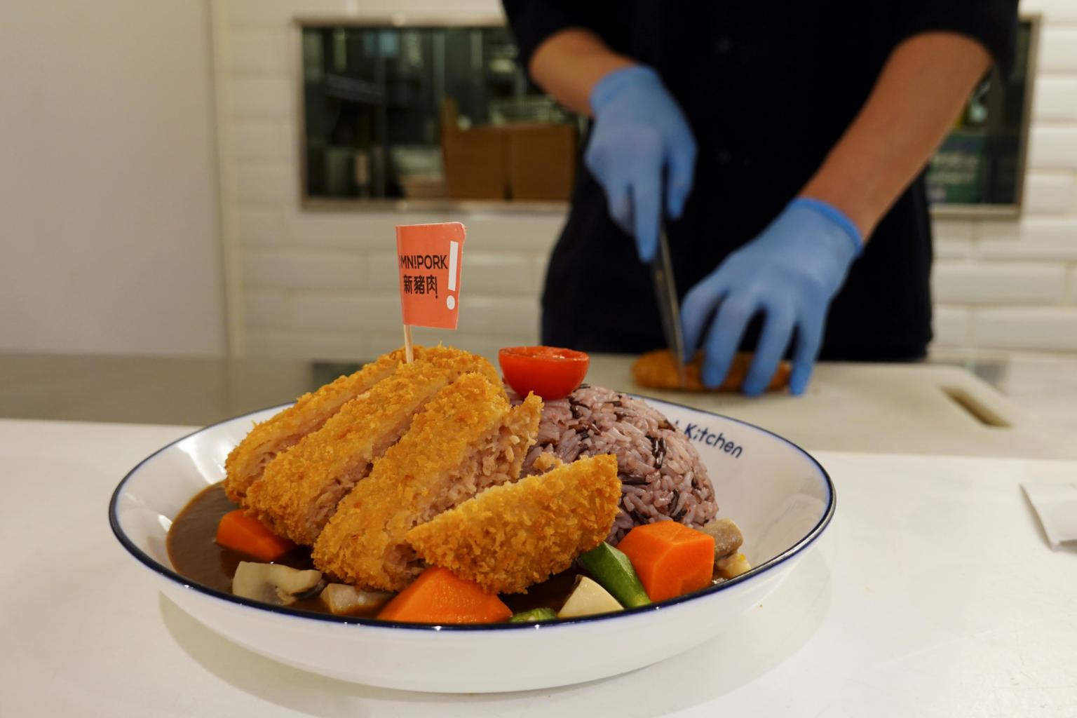A pork cutlet dish made with plant-based meat Omnipork at a vegan restaurant in Hong Kong on April 17, 2020.