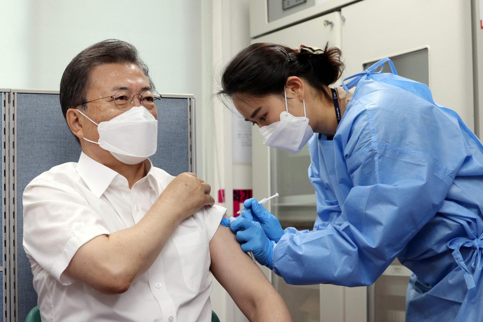 South Korean President Moon Jae-in receives a dose of the AstraZeneca Covid-19 vaccine in Seoul, on March 23, 2021.