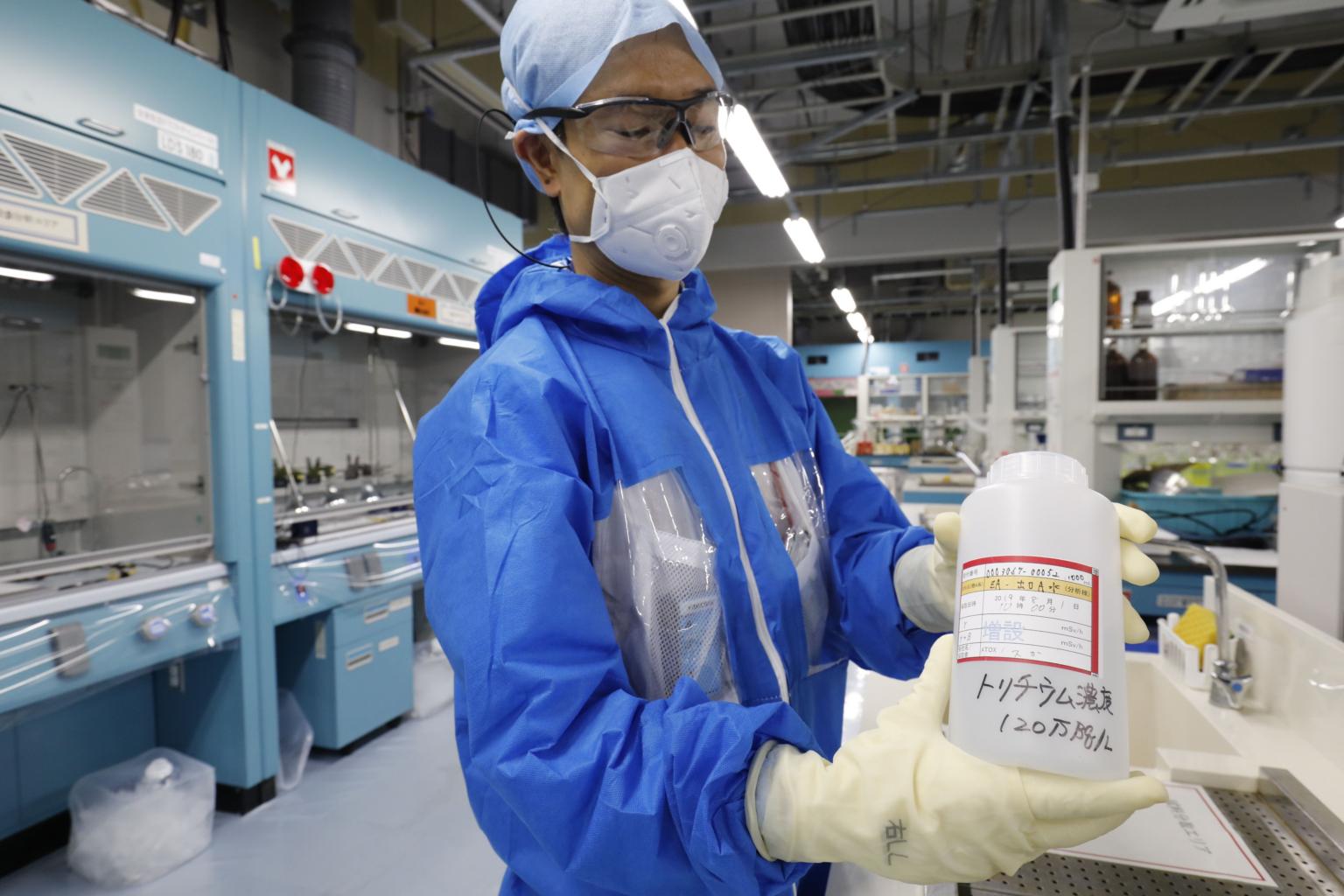 A Tokyo Electric Power Company researcher shows processed water where tritium remains, at a lab in Fukushima Dai-ichi nuclear plant in Okuma, Fukushima prefecture, Japan, on Oct 2, 2019.