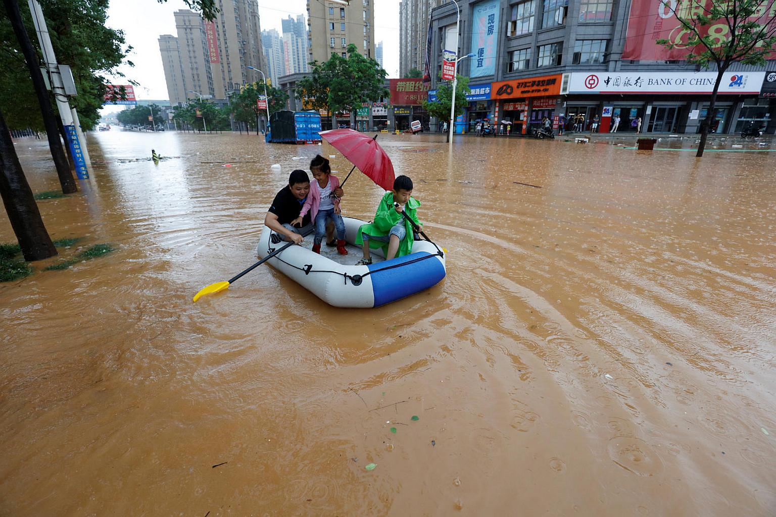 Residents make their way through a flooded area in Jiujiang, China, with an inflatable boat.