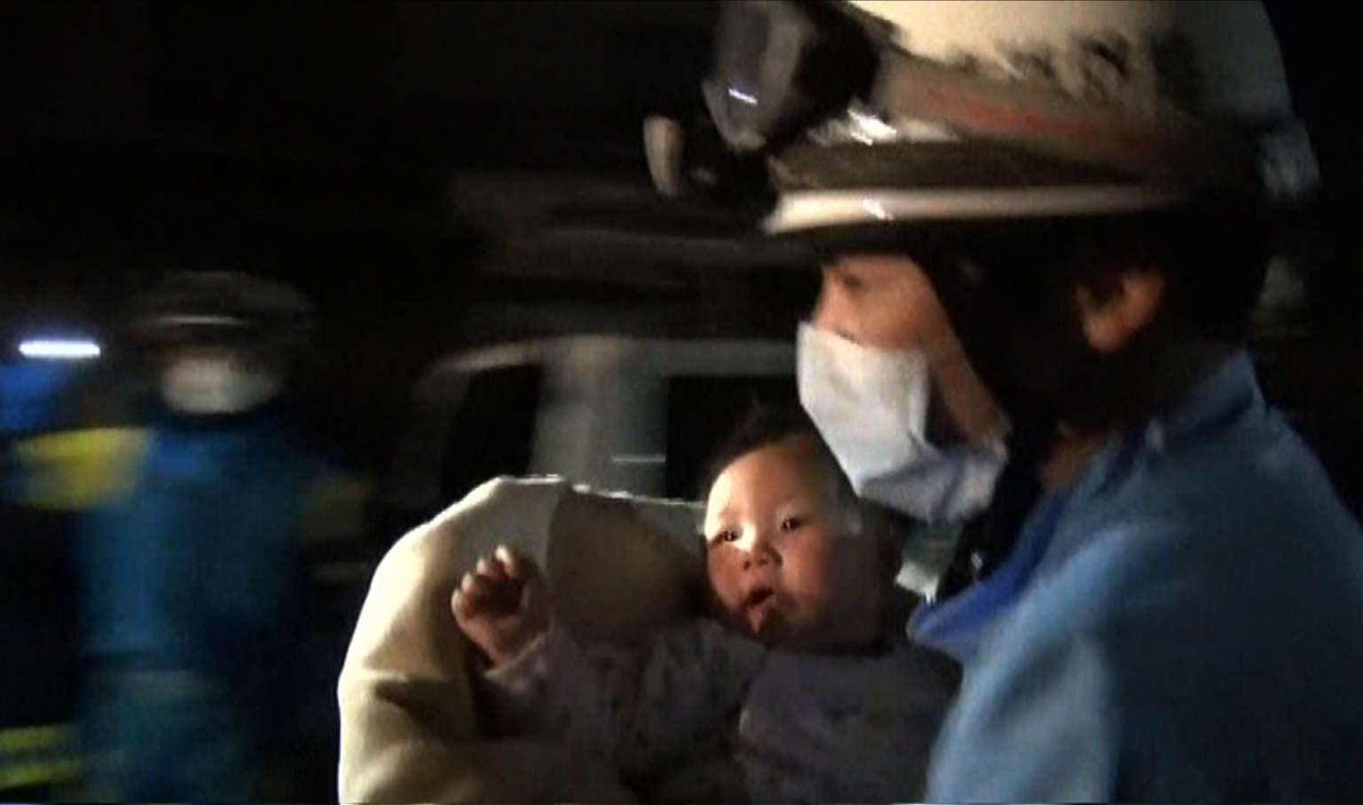 Video footage provided by the National Police Agency showed the tiny pink pyjama-clad baby gently carried away in a blanket by helmeted rescuers from the rubble of the home.