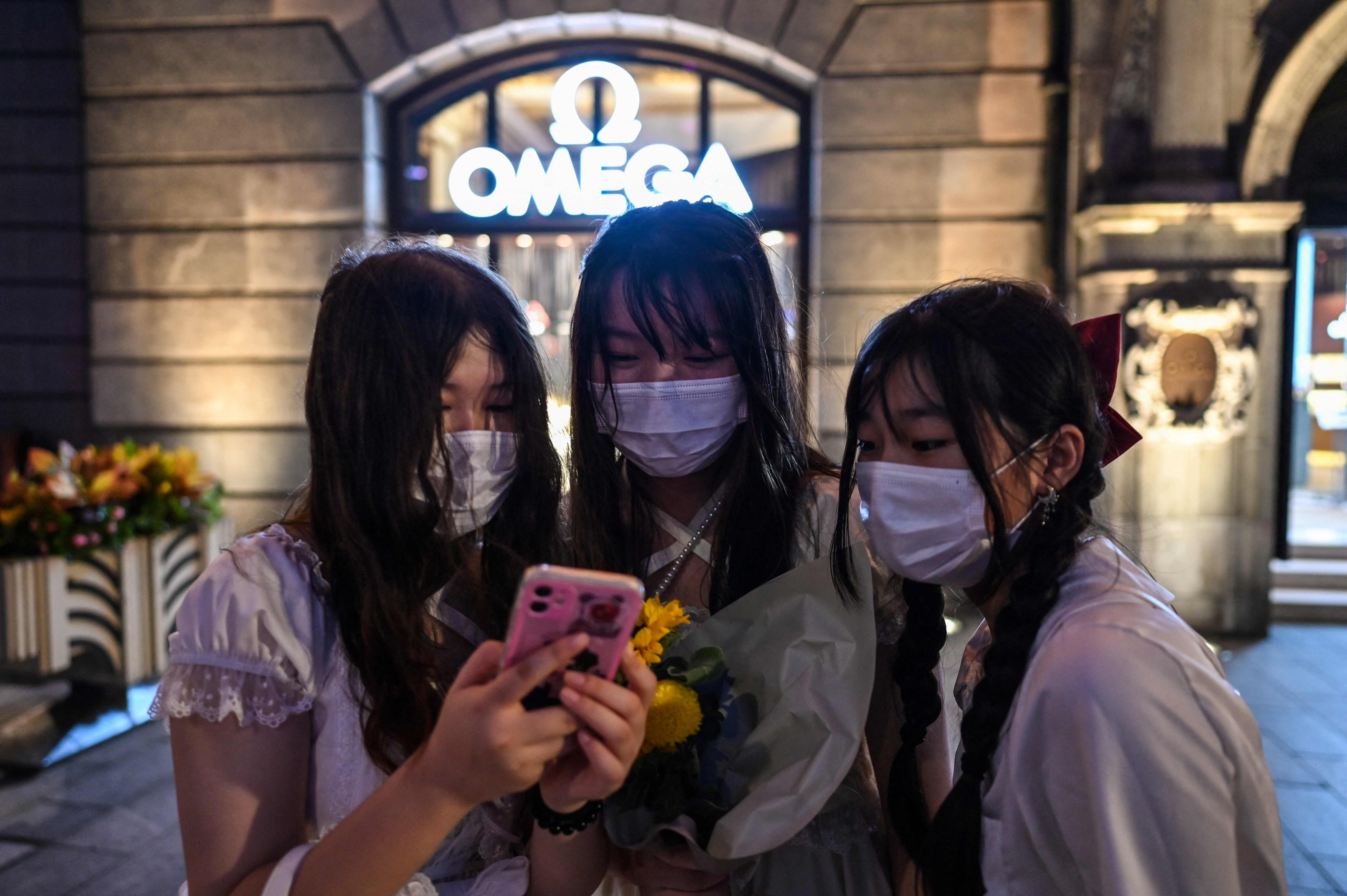 Young women look at a cell phone after taking pictures of themselves on The Bund in Shanghai on Aug 5, 2021.