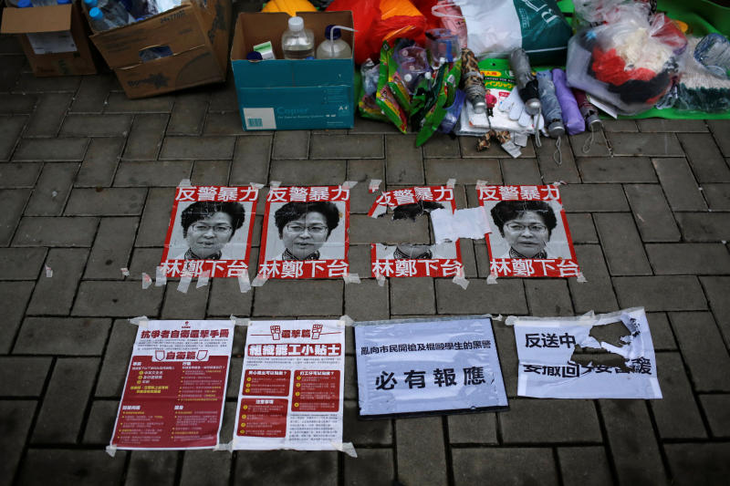 Posters demanding Hong Kong Chief Executive Carrie Lam steps down are seen in the streets of Hong Kong, om June 22, 2019.