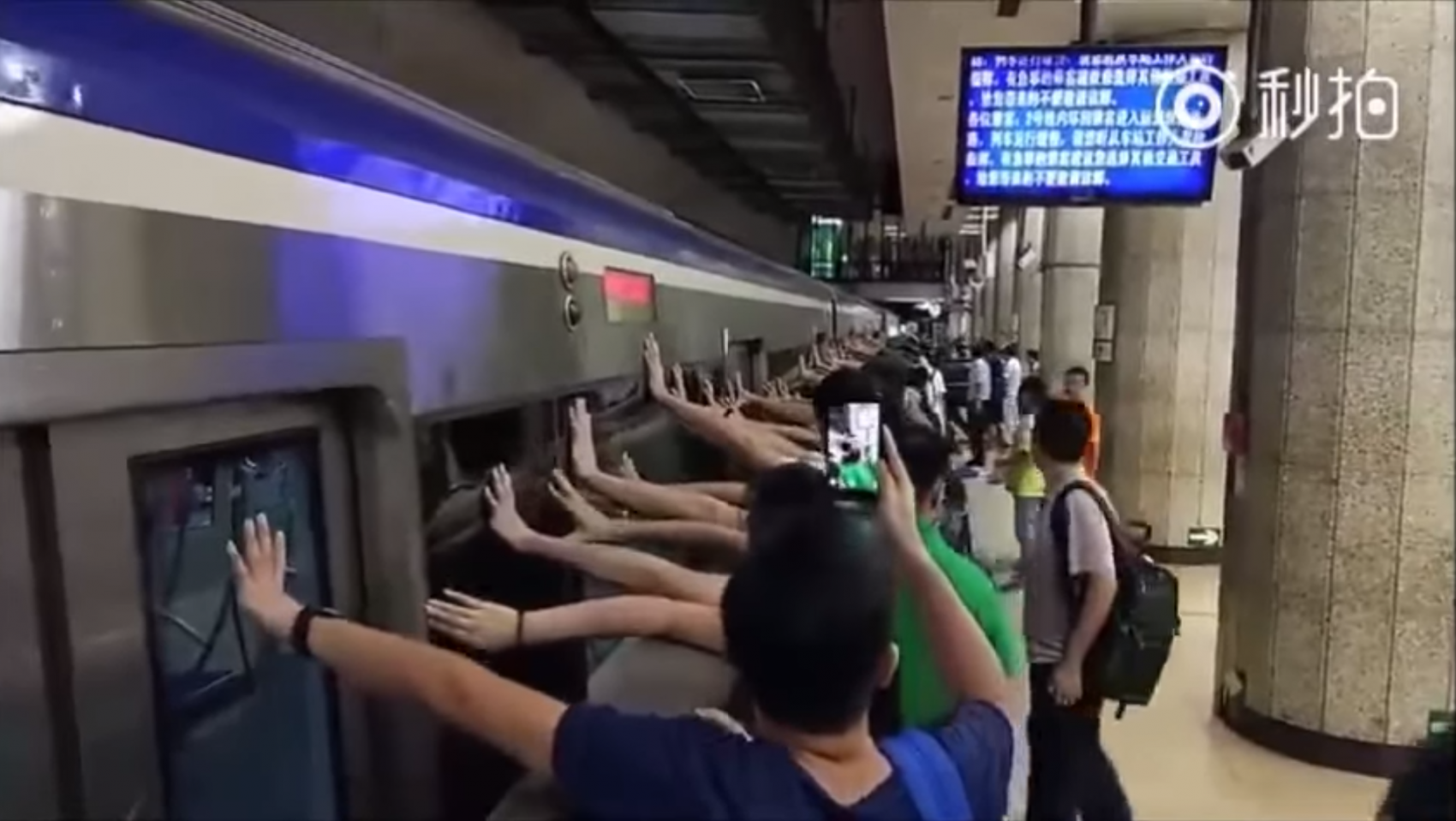 Beijing commuters rallying together to help train station staff and police officers free a man, who was trapped between the station platform and a train.