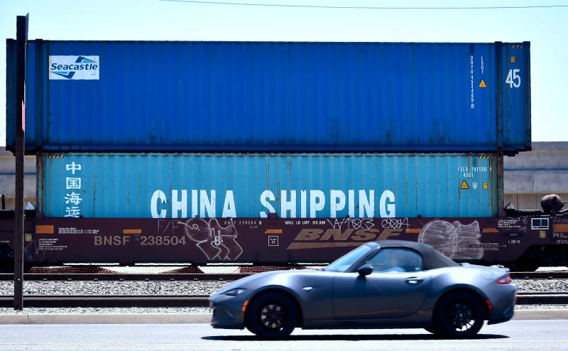 Shipping containers, including one from China Shipping, await transportation on a rail line at the Port of Long Beach on July 12, 2018 in Long Beach, California.
