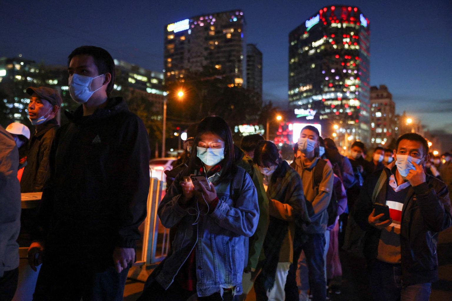 People line up at a bus stop during evening rush hour in Beijing as outbreaks of coronavirus disease continue in China on Oct 19, 2021.