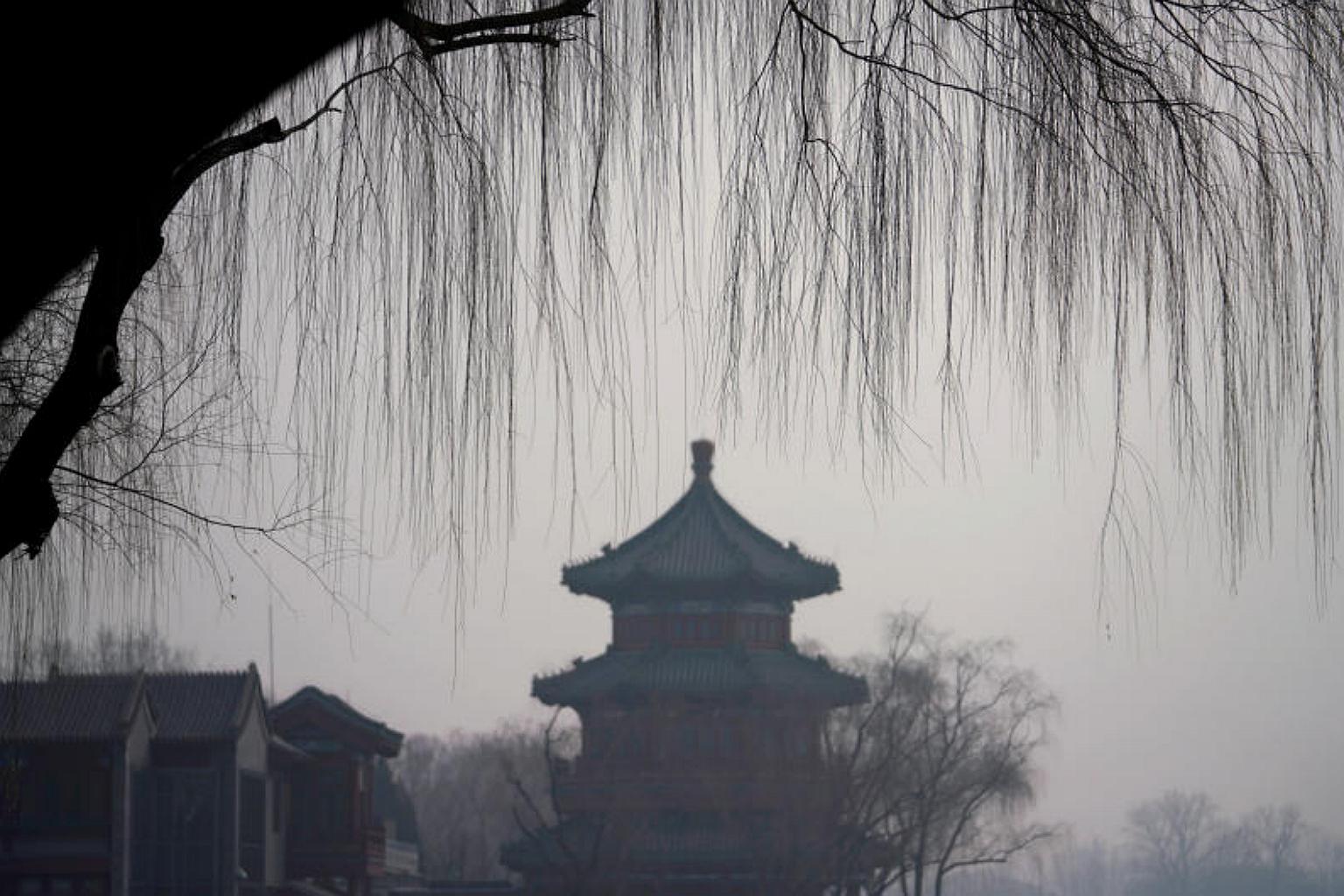 A traditional pavilion is seen amid smog in Beijing's Houhai area on Dec 29, 2017.