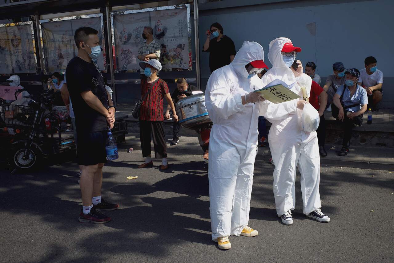 Medical staff members in full protective gear stand outside the Guang’an sports centre in Beijing, on June 16, 2020.