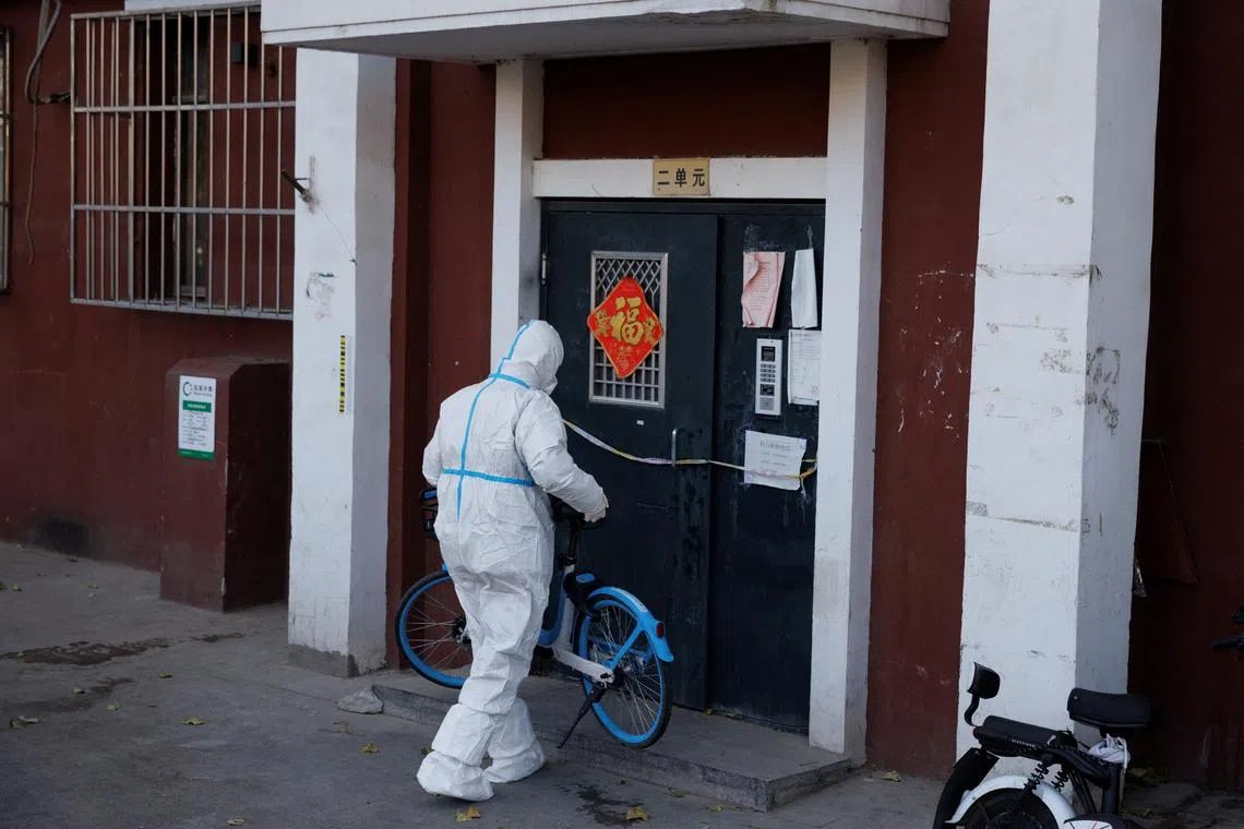 A pandemic control worker uses a bicycle to block the door to an apartment building under lockdown in Beijing on Nov 30, 2022.