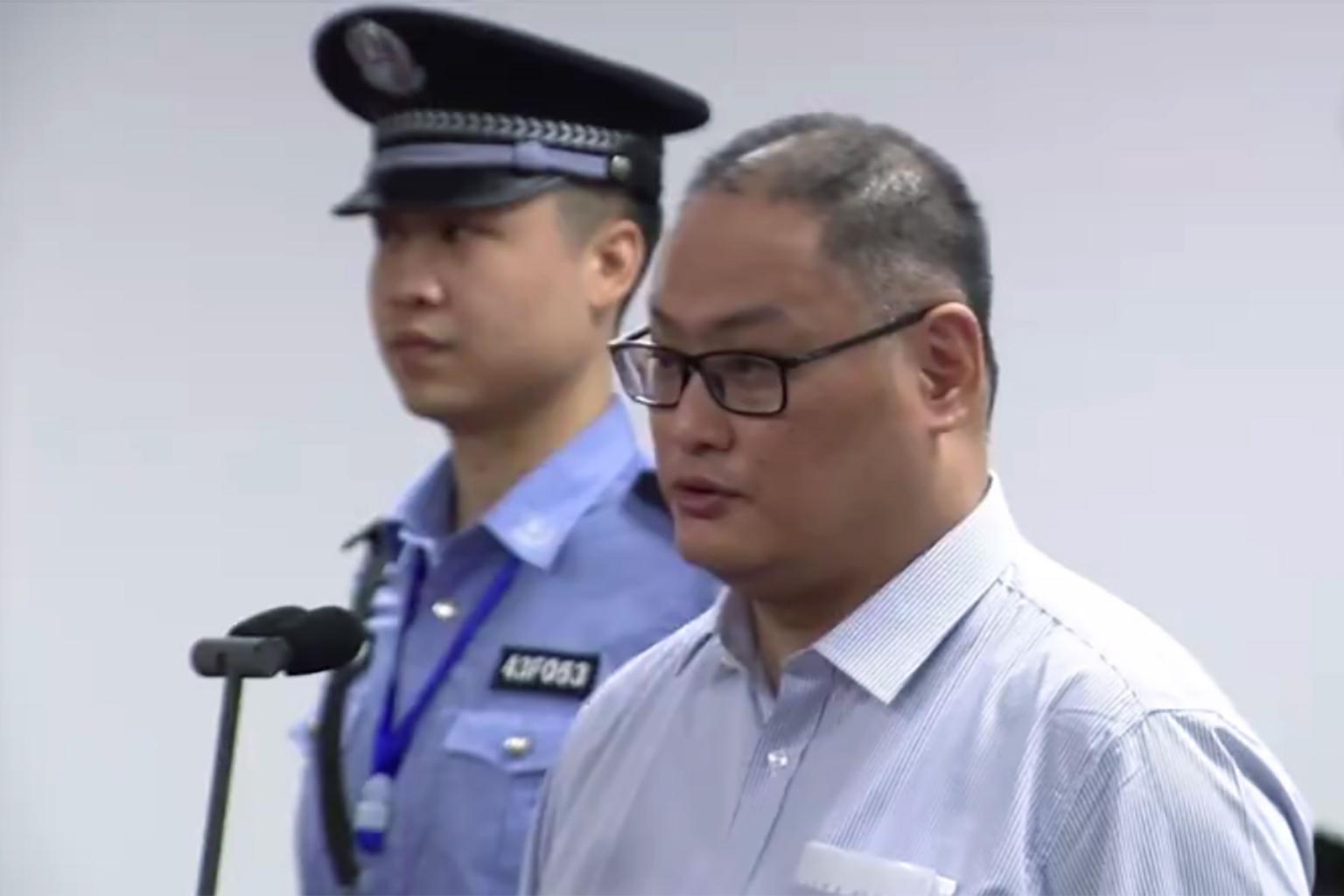This video grab from footage on the website of Yueyang Intermediate People's Court shows Taiwanese activist Lee Ming Cheh (right) appearing in court in Yueyang on Sept 11, 2017.