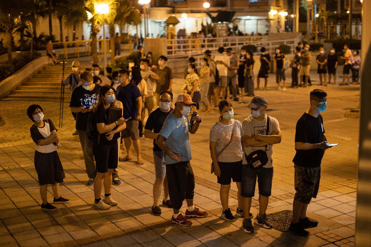 People wait in line to vote in the pro-democracy opposition's primary elections in Hong Kong on July 11, 2020.