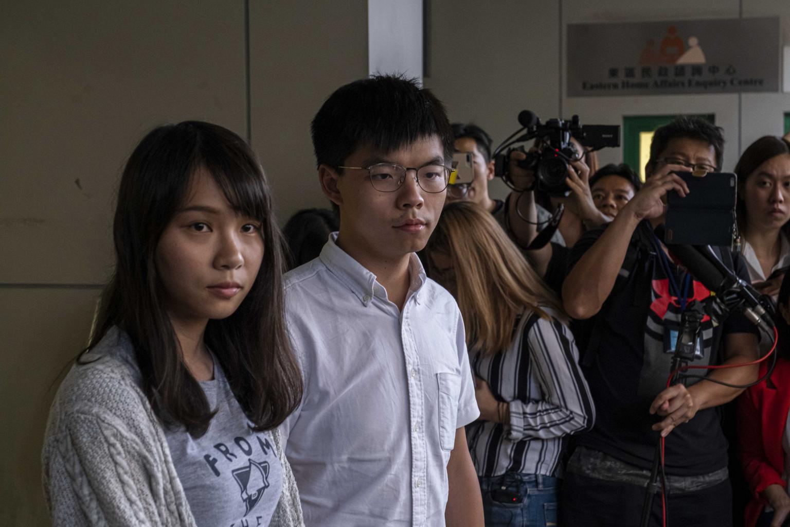 Activists Agnes Chow and Joshua Wong speak to reporters after being arrested by the police and released on bail in Hong Kong on Aug 30, 2019.
