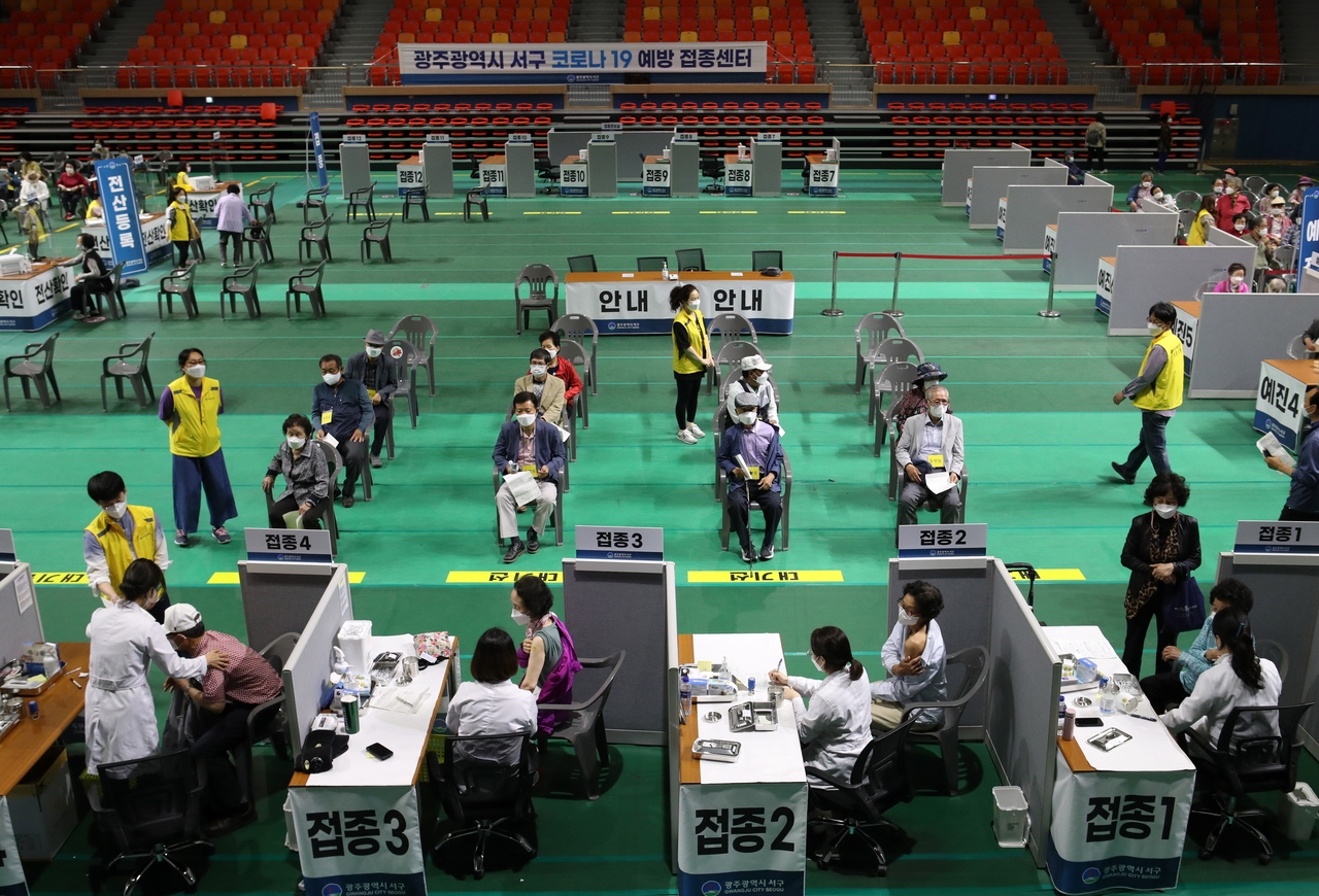 People aged over 75 get vaccinated at a gym in Gwangju, south of Seoul, on May 24, 2021.