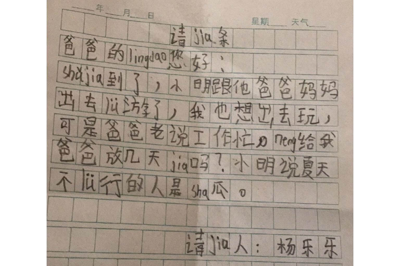 The boy, who signed off the handwritten note as Yang Lele, asked his father's employer to let his father go on a few days' leave, so that they can go on a holiday together.
