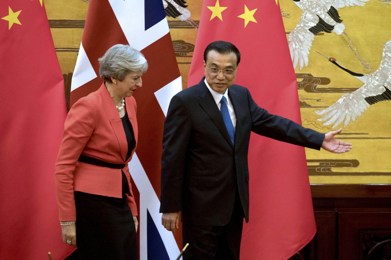 British PM Theresa May and Chinese Premier Li Keqiang leaving the Great Hall of the People after a signing ceremony in Beijing on Jan 31, 2018.