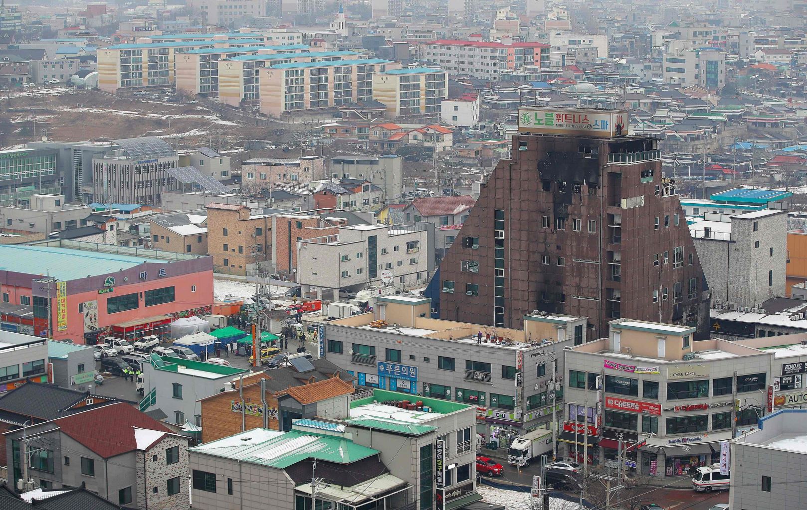 Yonhap photos of the scene showed parked cars surrounding the building, with some witnesses saying that combined with narrow roads to delay the response by fire trucks.
