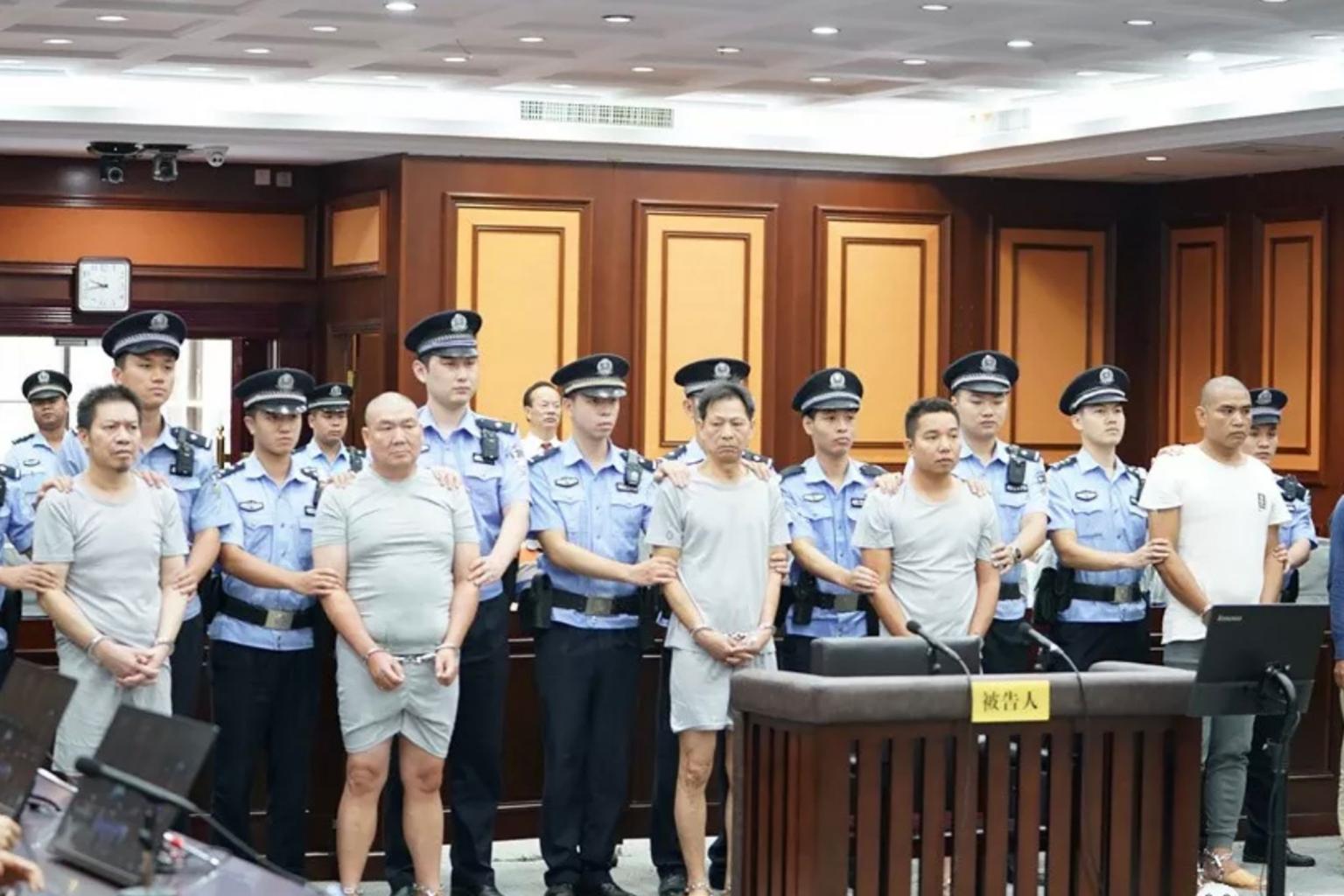 In a handout photo taken on Oct 17, 2019, five hitmen and the man who ordered the killing stand during their sentencing at the Nanning Intermediate People's Court, in Guangxi, China.
