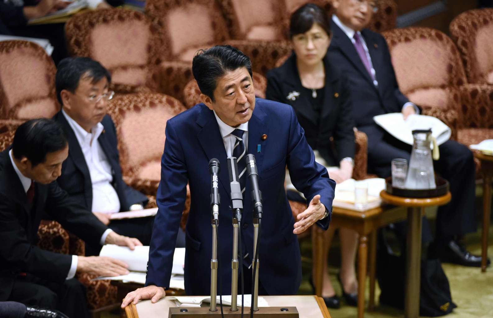 Japan's Prime Minister Shinzo Abe (C) answers questions during a budget dommittee meeting in the Upper House at parliament in Tokyo on July 25, 2017, as he and other relevant ministers were expected to face more questioning over issues over a suspected scandal.