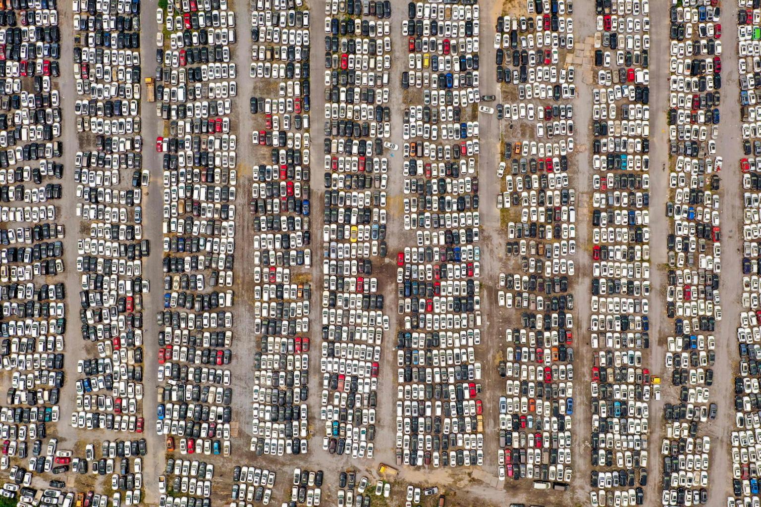 An aerial photo taken on Aug 10, 2021, shows vehicles damaged by floods in July at a carpark in Zhengzhou.