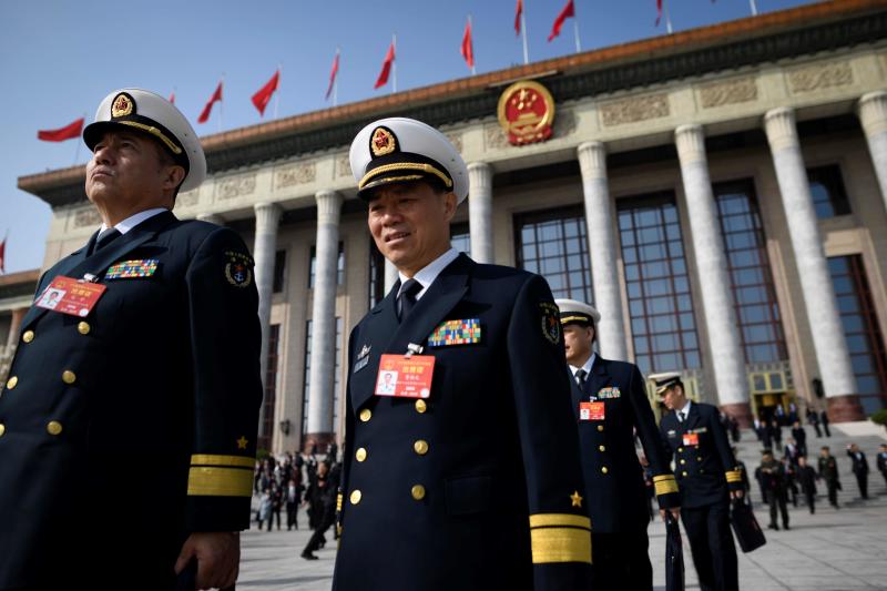 Delegates from the Chinese People's Liberation Army leave the Great Hall of the People after a preparatory meeting the day before the opening session of the National People's Congress in Beijing on March 4, 2019.