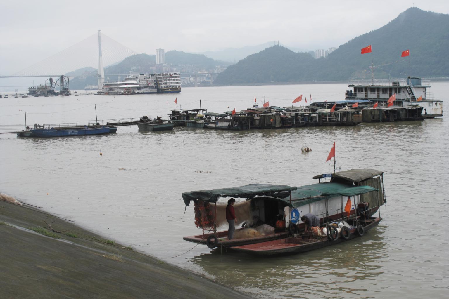 Chinese flags seen on boats on the Yangtze river in Fengdu county, Chongqing, on Oct 15, 2019.