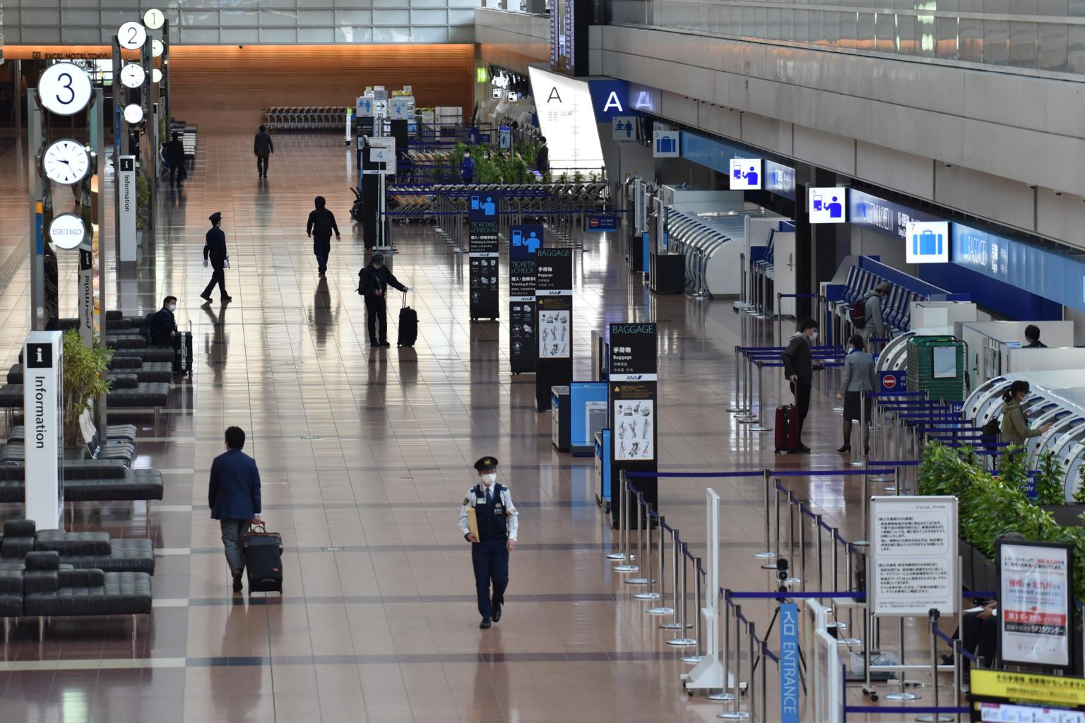 Passengers and staff at the departure floor of Tokyo's Haneda airport, on April 28, 2020.