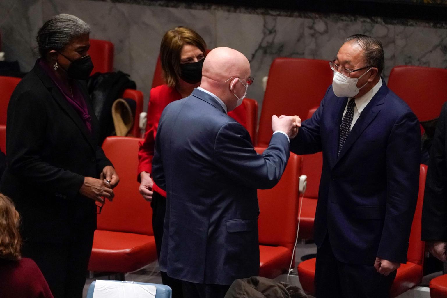 China's ambassador to the UN Zhang Jun (right) greeting Russia's ambassador Vassily Nebenzia, next to (from left) US ambassador Linda Thomas-Greenfield and Norway ambassador Mona Juul.