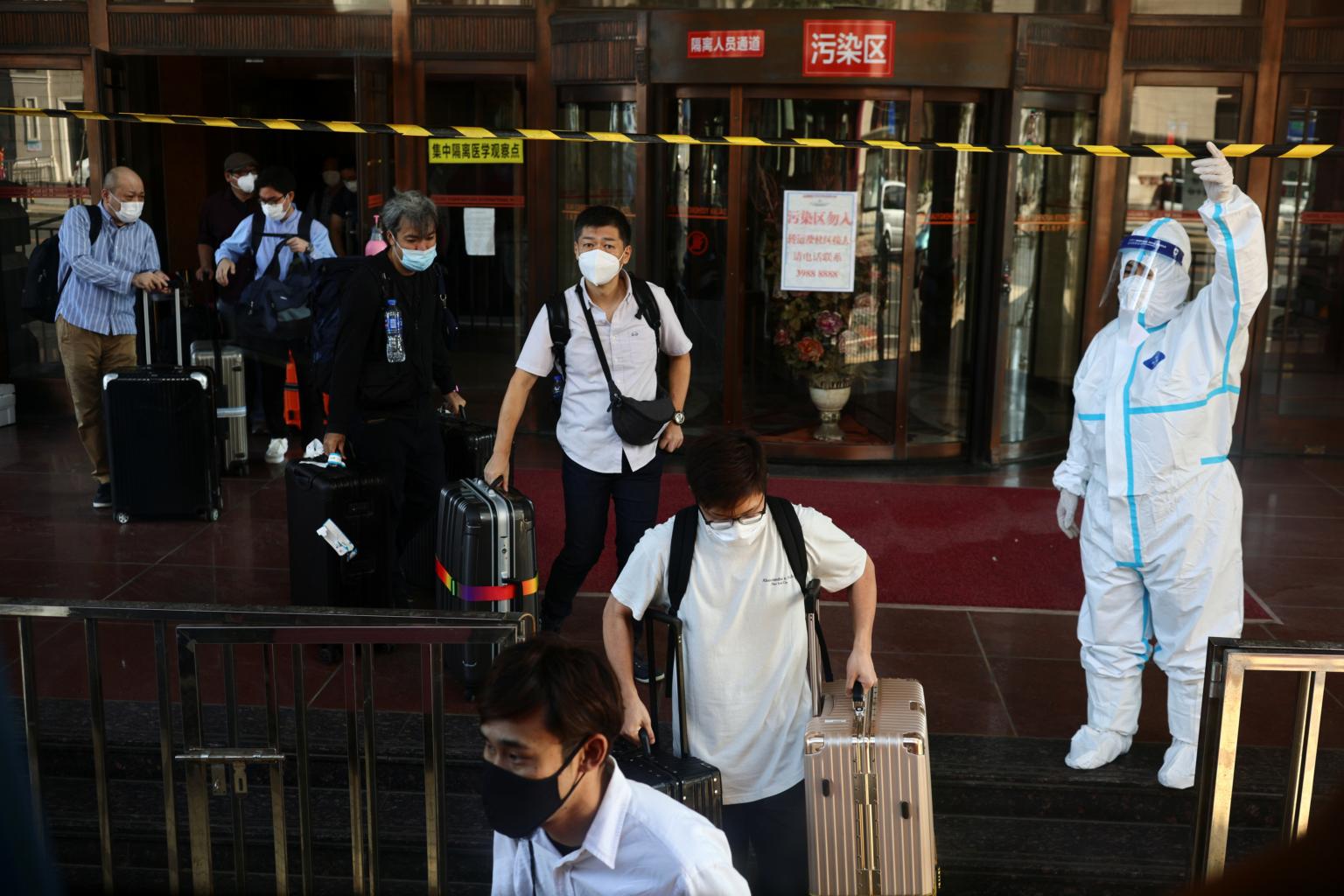 Travellers leaving a hotel after completing their mandatory isolation in Dalian on Sept 29, 2021.