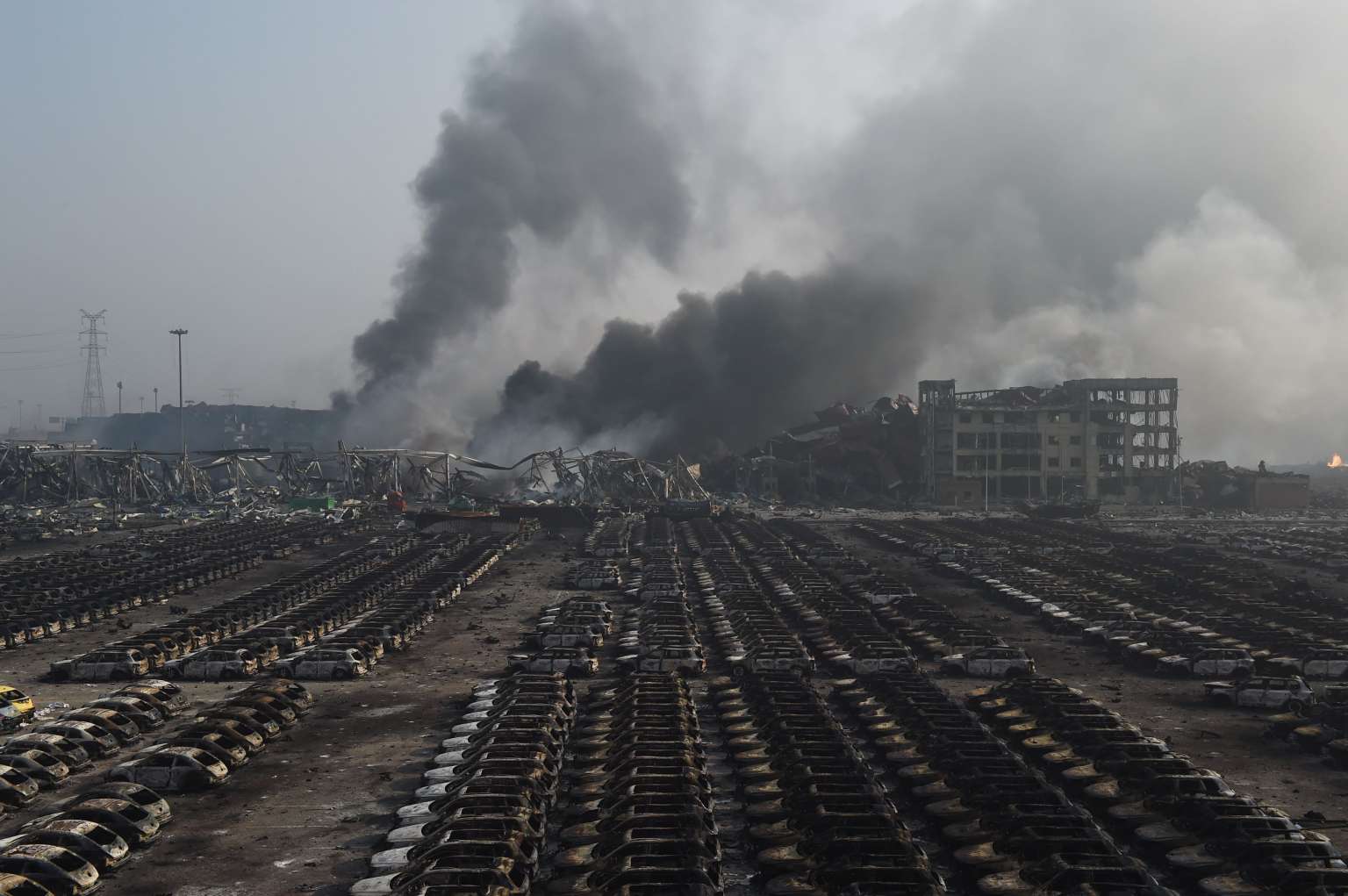 Smoke billows behind rows of burnt out cars at the site of a series of explosions in Tianjin, northern China on Aug 13, 2015.