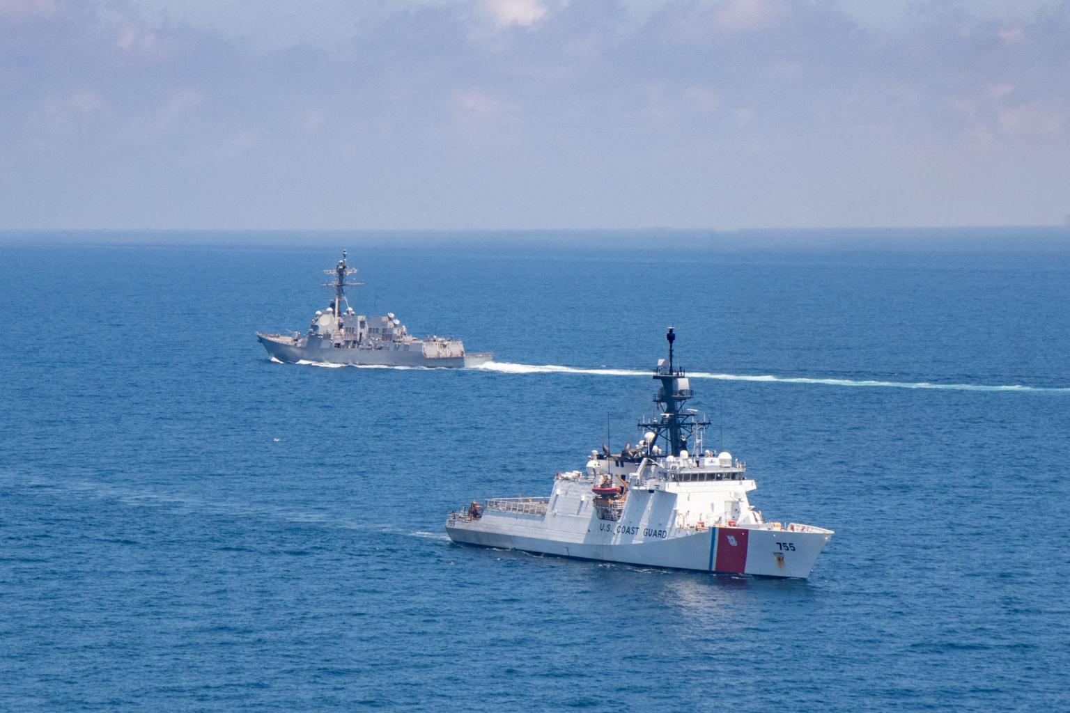 A photo from Aug 27, 2021, shows the guided-missile destroyer USS Kidd and US Coast Guard cutter Munro in the Taiwan Strait.