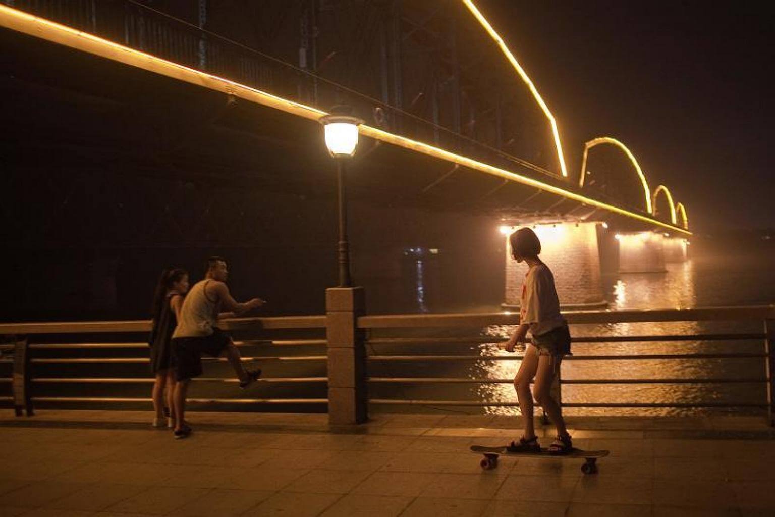 A young woman skateboards under the Friendship bridge on the Yalu River connecting the North Korean town of Sinuiju and Dandong in Chinese border city of Dandong.